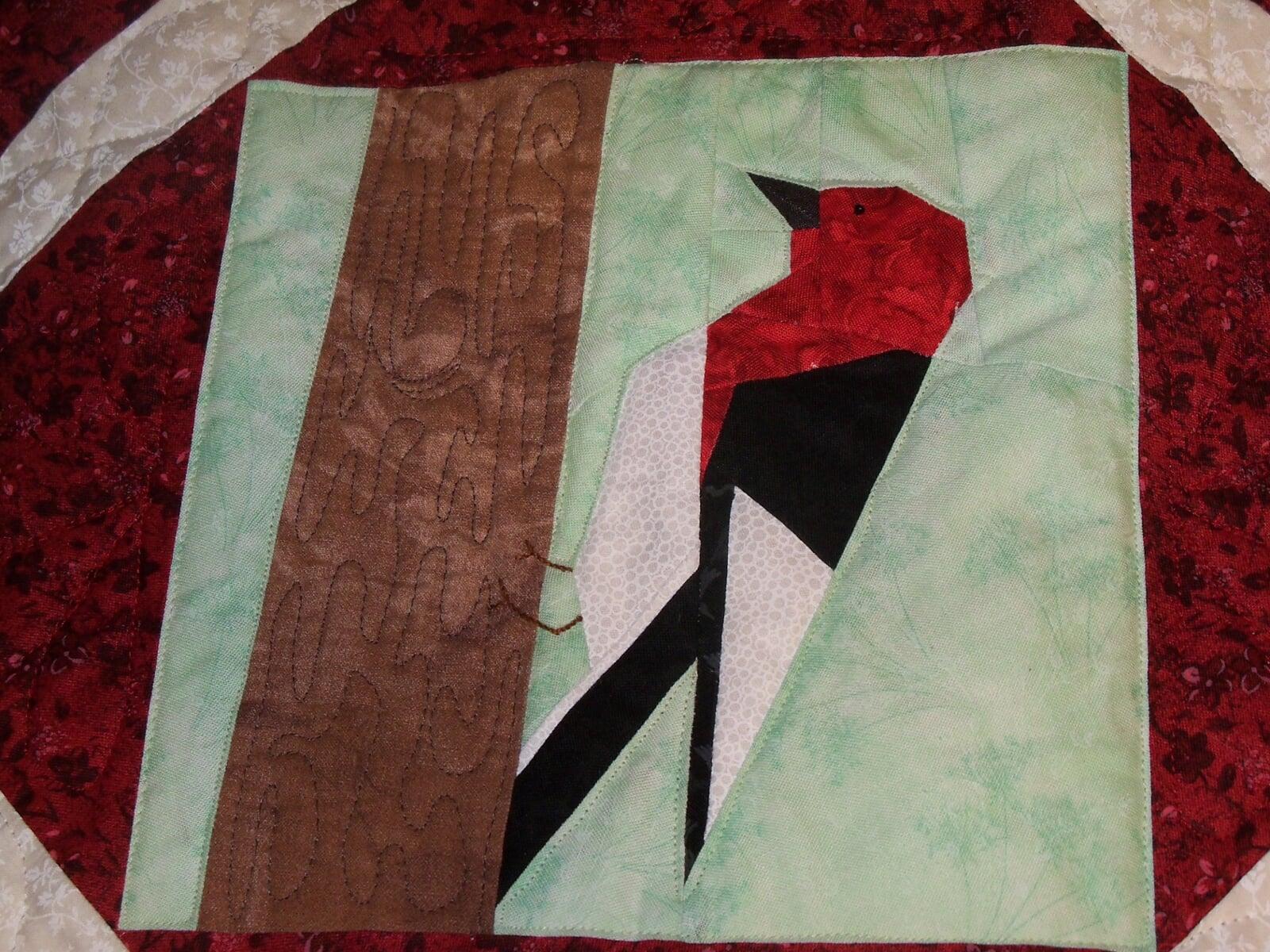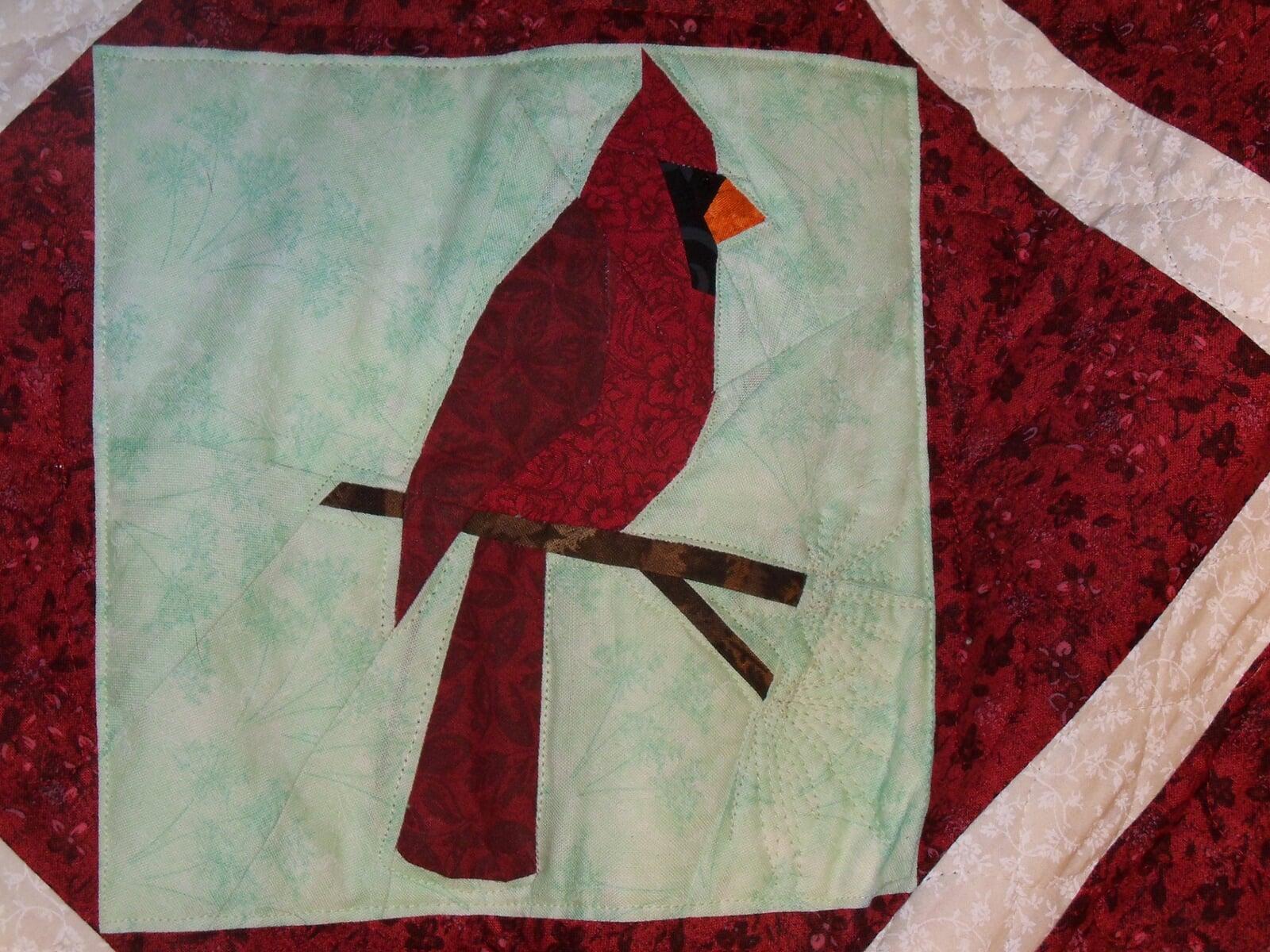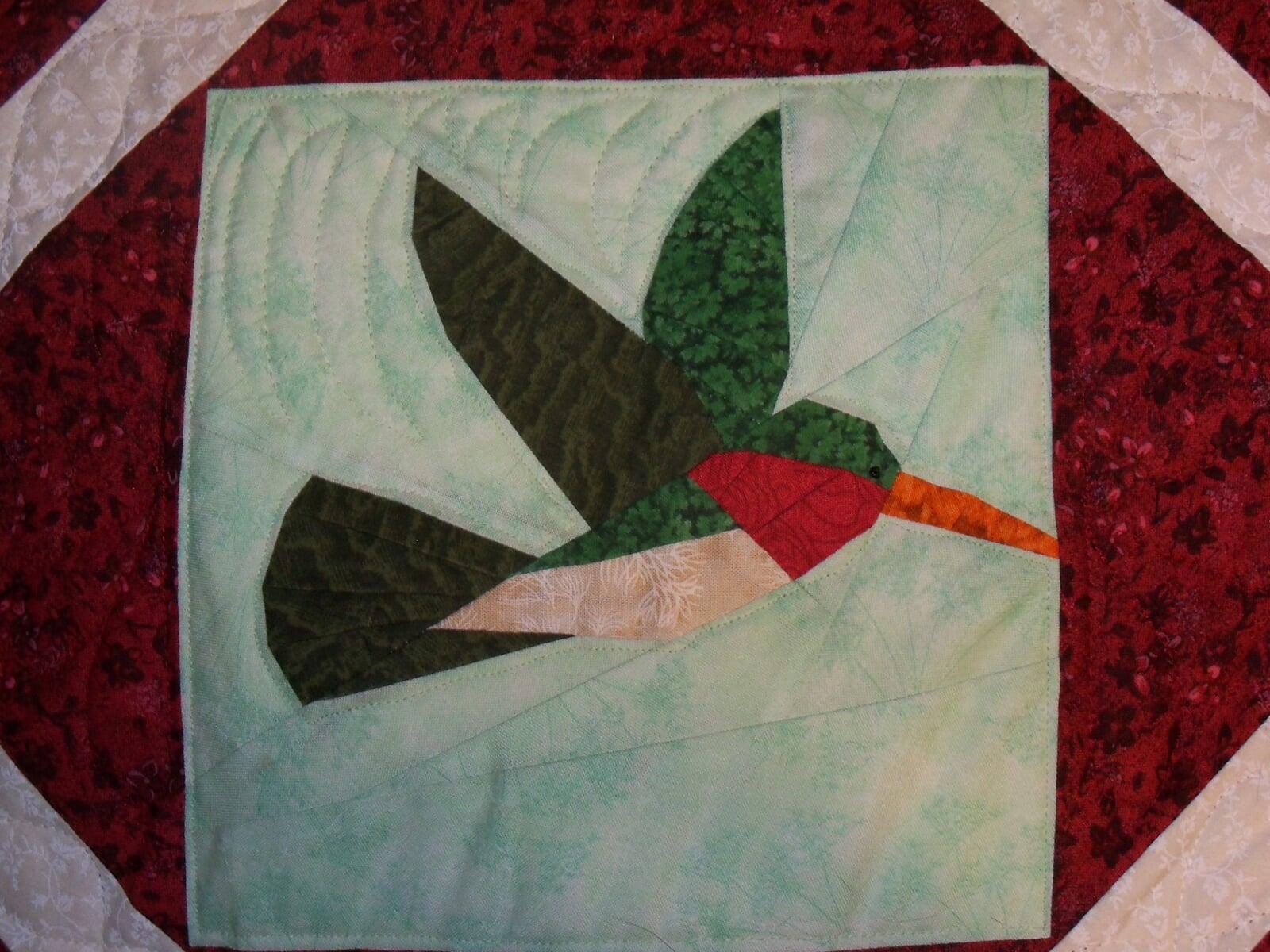 My grandma loved birds, so the year before her 85th birthday I told my mom I wanted to learn paper-piecing to make a bird quilt for Grandma. I found a book with paper-pieced bird patterns, and my mom and I each made one bird block a month. I used my twelve blocks to create this special quilt for my Grandma.